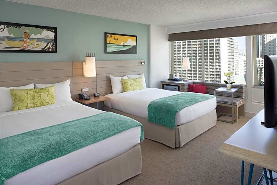 This room has a balcony with Waikiki City views. This room features air conditioning, a mini-fridge, and a 49 in. TV.